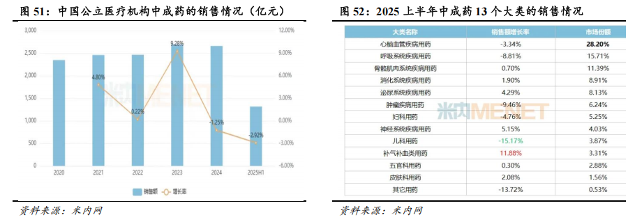 多重因素影响,中药板块经营业绩继续承压。根据米内网的统计数据,2025H1,中国公立医疗机构终端中成药销售规模约为1317亿元,同比-2.92%。分品类来看,2025H1,补气补血类用药、神经系统疾病用药、泌尿系统疾病用药、皮肤科用药、消化系统疾病用药的销售额实现较快增长,而儿科用药、肿瘤疾病用药、呼吸系统疾病用药的销售额出现较大幅度的下滑。从中药上市企业的经营情况来看,2025年1-9月,中药上市企业实现营业收入2571.35亿元,同比-3.85%;实现归母净利润300.82亿元,同比-1.22%。其中,2025Q3,中药上市企业实现营业收入799.29亿元,同比-1.11%;实现归母净利润73.97亿元,同比-5.85%。从盈利水平来看,2025年1-9月,中药上市企业的毛利率、期间费用率、净利率分别同比变动-0.64pp、+0.13pp、+0.34pp;2025Q3,中药上市企业的毛利率、期间费用率、净利率分别同比变动+0.51pp、+1.24pp、-0.54pp。总的来看,由于医药消费需求偏弱、中成药集采、医保监管趋严等因素影响,中药企业的经营业绩继续承压,但受益于中药材价格下降以及产品结构优化等,中药企业2025Q3的毛利率出现初步改善迹象。