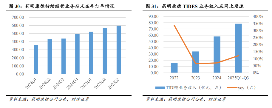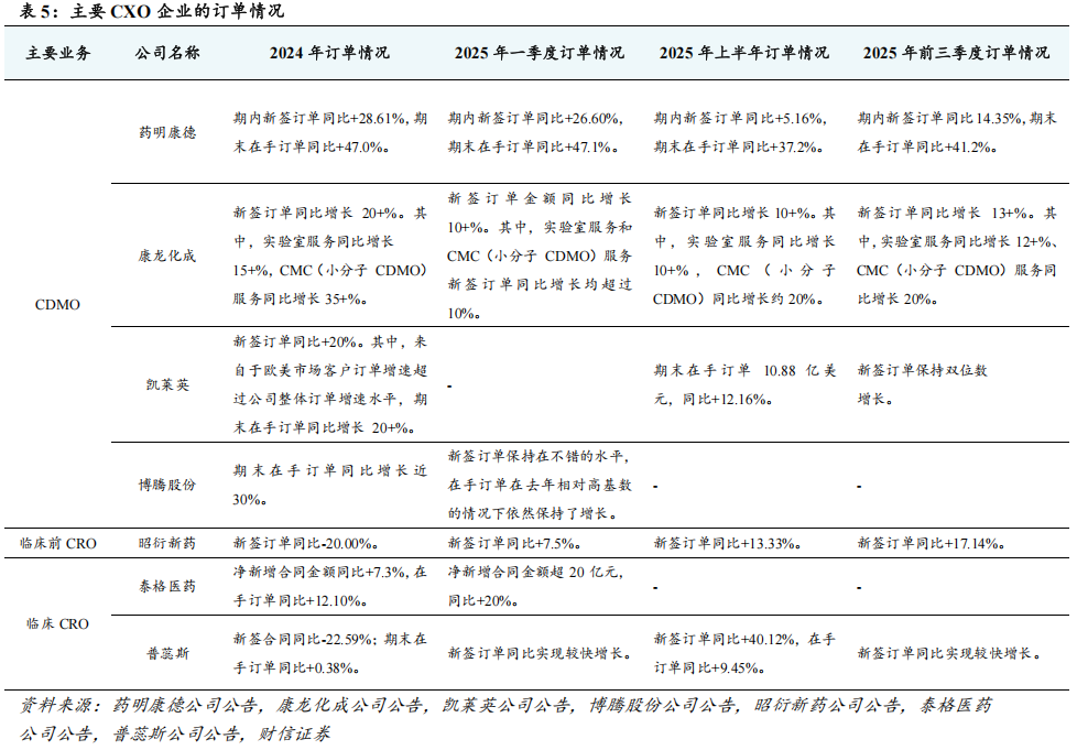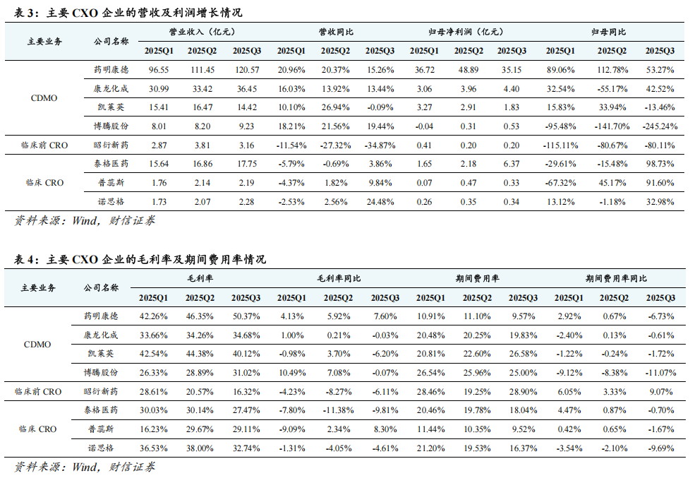 CXO企业的新签订单增长较好,经营业绩有望持续改善。2025年前三季度,CXO企业的经营业绩出现明显的分化。受益于欧美客户收入增长稳健、新兴业务(如多肽、寡核苷酸、ADC药物研发生产等)、商业化项目增多以及持续放量等,CDMO企业的经营业绩实现较好的增长,彰显更强的增长韧性,且在手订单及新签订单均保持良好的增长。以药明康德为例,2025年前三季度,公司TIDE业务实现收入78.4亿元,同比增长121.10%,成为公司重要的业绩增量来源。受益于规模效应、项目价格较为稳定、降本增效等,CDMO企业的毛利率、期间费用率呈现改善趋势。区别于CDMO企业,受前期国内研发需求偏弱、项目价格竞争激烈以及部分订单被取消等,以昭衍新药、泰格医药为代表的临床前CRO、临床CRO企业的经营业绩增长承压,盈利水平出现下滑。受益于国内研发需求的回暖以及前述不利因素的影响逐渐消化等,临床前CRO、临床CRO企业的新签订单呈现改善趋势,临床CRO企业2025Q3业绩同比增速转正。例如,2025年前三季度,昭衍新药的新签订单金额同比增长17.14%,其中2025Q3新签订单金额同比增长24.00%;又如,2025年上半年,普蕊斯的新签订单金额同比增长40.12%,在手订单金额同比增长9.45%;再如,2025Q3,临床CRO泰格医药、普蕊斯、诺思格的营收同比增速分别为+3.86%、+9.84%、+24.48%,营收呈现同比改善趋势。展望未来,在美联储降息、BD及并购交易持续活跃、制药企业研发支出稳健增长、国内创新药支持政策落地显效、双抗及ADC等新兴技术驱动的综合影响下,CXO企业的服务需求、经营业绩有望持续改善。在新一轮的医药生物技术创新周期中,双抗、ADC、多肽、小核酸等药物需求将呈现快速增长,建议重点关注在多肽与ADC等新兴领域布局领先、新签订单增长良好、海外服务能力建设领先的CXO龙头。