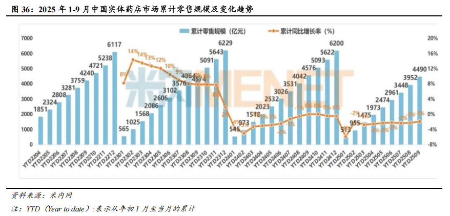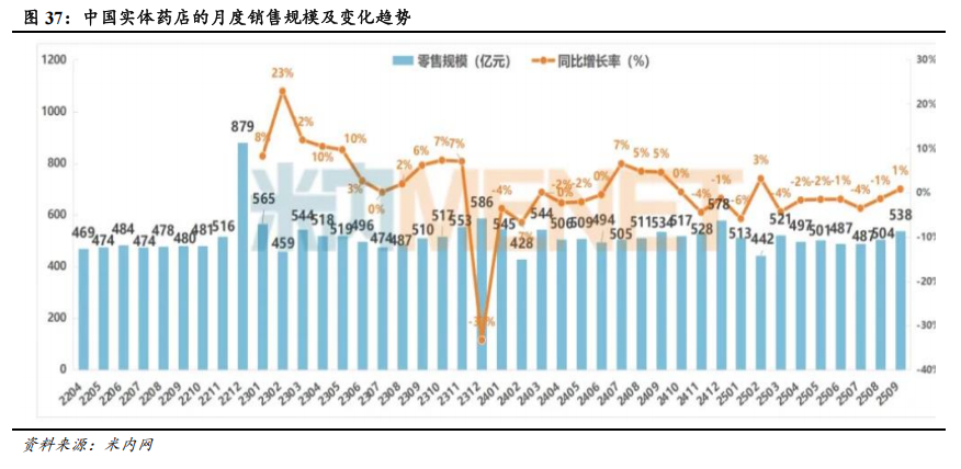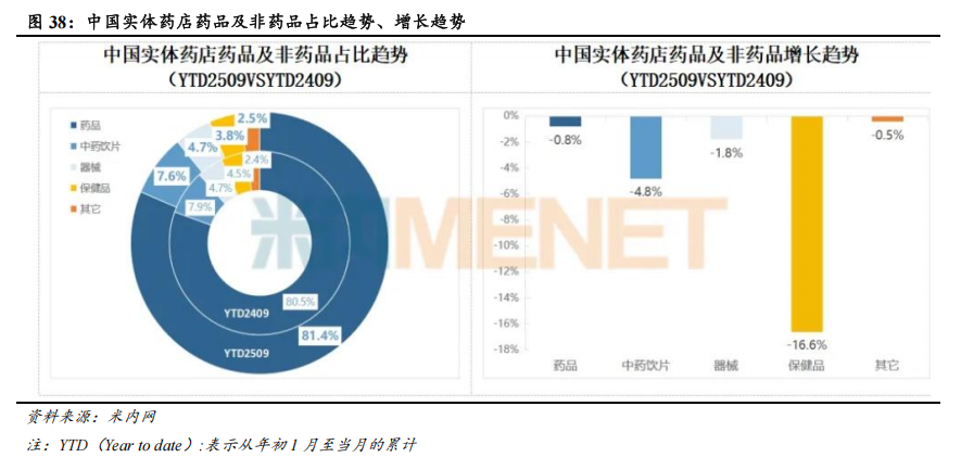 零售药店行业规模增长短期承压,复苏动能在积聚。根据米内网的统计数据,2025年1-9月,中国实体药店销售规模(含药品与非药品)达4490亿元,同比下降1.90%,同比降幅较2025年1-8月有所收窄。实体药店行业扩张红利减弱,从“追求规模”转向“提升质量”,专业化及多元服务拓展成为驱动市场持续发展的新动力。从月度销售数据来看,2025年9月,中国实体药店销售规模达538亿元,较2025年8月(504亿元)有明显的改善,同比增长约1.00%,在前期震荡基础上延续了微弱的增长势头,反映出市场在消费需求释放、行业自我调整等因素作用下有向好的变化,实体药店市场的复苏动能在积聚。分产品类别来看,2025年1-9月,中国实体药店药品、中药饮片、器械、保健品、其它产品的销售占比分别为81.40%、7.60%、4.70%、3.80%、2.50%,销售额同比增速分别为-0.80%、-4.80%、-1.80%、-16.60%、-0.50%,保健品销售额降幅最大。虽然实体药店的销售规模增长面临阶段性压力,但实体药店在药品销售中的渠道占比稳步提升,网上药店的药品销售呈现快速增长。根据米内网的统计数据,2018-2025H1,在药品销售的三大终端中(公立医院终端、零售药店终端、公立基层医疗终端),零售药店终端的销售占比由22.90%逐渐提升至30.80%。2025H1,公立医疗终端、零售药店终端、公立基层医疗终端的药品销售额同比增速分别为-2.80%、+1.60%、-4.20%,零售药店终端的药品销售呈现更强的韧性,主要受益于处方外流以及网上药店销售额的快速增长。2025H1,实体药店、网上药店的药品销售额分别为2412、455亿元,同比增速分别为-0.90%、+16.80%。