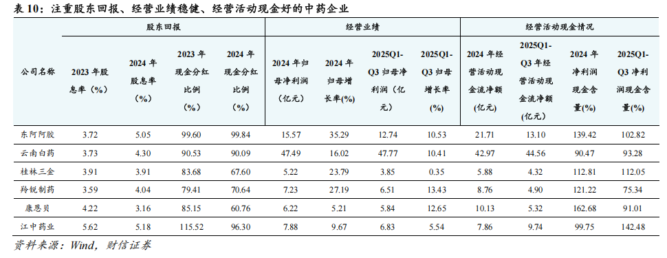 关注“高股息”中药企业。在中药行业整体增长承压的背景下,部分中药企业通过发挥品牌优势、产品品类扩充及优化、销售渠道拓展、内部管理优化等,实现高质量的增长,并保持较高水平的股息率。例如,东阿阿胶、羚锐制药近几年保持3.5%以上的股息率、70%以上的现金分红比例、双位数的业绩增长、75%以上的净利润现金含量,是高股息投资策略的较优选择,值得持续关注。