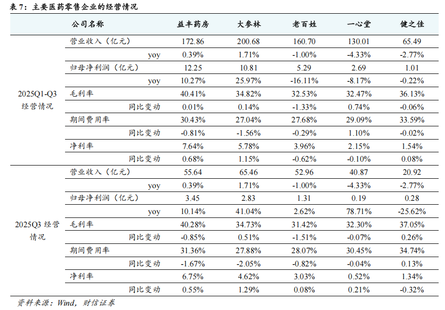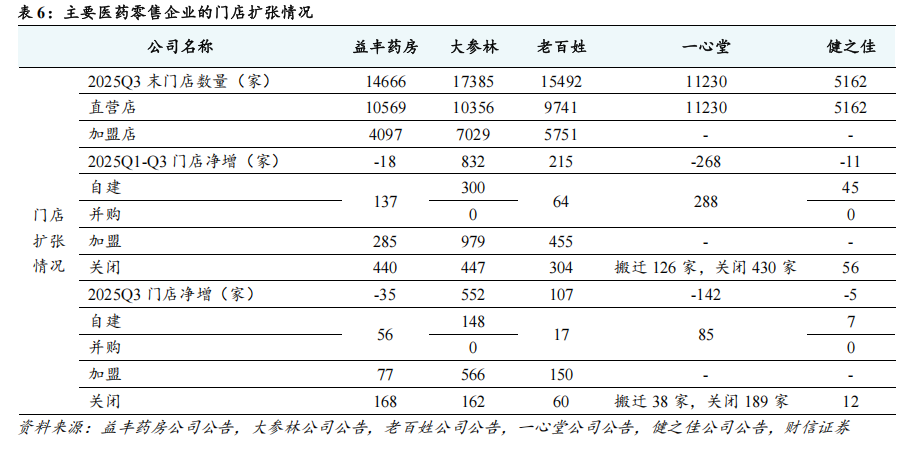 头部零售药店企业扩张步伐放缓,盈利水平稳中有升,经营业绩有望出现改善。2025年前三季度,头部零售药店企业放缓门店扩张步伐,仅大参林、老百姓的门店数量实现了正增长。在扩张方式,头部零售药店企业主要采取加盟的方式进行扩张,并购扩张较少,关闭门店数均明显高于自建门店数,积极优化存量直营门店。从经营情况来看,由于医药消费需求偏弱、行业竞争激烈、行业政策趋严、部分门店关闭等,头部零售药店企业的营收增长整体承压,仅益丰药房、大参林的营业收入实现正增长。由于门店扩张步伐放缓、存量门店优化、产品结构调整以及企业加大力度降本增效等,头部零售药店企业的整体盈利水平稳中有升,益丰药房、大参林的归母净利润实现双位数增长,老百姓、一心堂的2025Q3归母净利润实现正增长。展望未来,伴随着促消费政策持续发力、行业政策影响逐渐减弱、行业出清带来单店客流增加等,头部零售药店企业的经营业绩有望改善,建议关注精细化管理能力强、合规运营能力强、区位优势明显、财务状况健康、具备并购整合优势的头部零售药店企业,如益丰药房等。