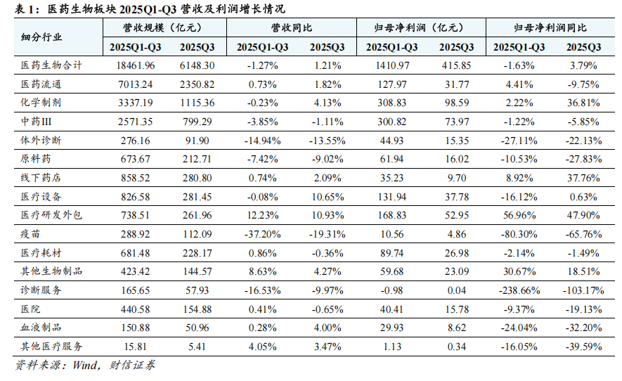 2025年前三季度,医药生物板块整体业绩表现承压,细分板块业绩表现分化,创新药械产业链业绩表现较好。从医药生物行业上市公司的经营业绩来看,2025Q1-Q3,医药生物板块实现营业收入18461.96亿元,同比-1.27%;实现归母净利润1410.97亿元,同比-1.63%。单看2025Q3,医药生物板块实现营业收入6148.30亿元,同比+1.21%;实现归母净利润415.85亿元,同比+3.79%;医药生物板块的业绩同比增速呈现逐季改善趋势。分子板块看,2025Q1-Q3,医药研发外包、其他生物制品板块营收、净利润增速靠前。其中,医药研发外包板块营收同比+12.23%,归母净利润同比+56.96%,主要受益于多肽、ADC等药物带动需求改善,以及盈利水平提高。其他生物制品板块营收同比+8.63%,归母净利润同比+30.67%,主要受益于创新药放量等。由于上年同期产生大额对外授权收入导致基数较高,以及部分仿制药集采降价与需求减弱等,化学制剂板块表观业绩增速偏低。2025Q1-Q3与2025Q3,化学制剂板块营收分别同比变动-0.23%、+4.13%,归母净利润分别同比变动+2.22%、+36.81%。受益于创新产品上市放量,以恒瑞医药、百济神州、艾力斯、海思科、迪哲医药等为代表的创新药企业绩呈现快速增长。受益于门店扩张步伐放缓、存量门店优化、产品结构调整以及部分企业公允价值变动收益等,线下药店2025Q3的归母净利润同比变动+37.76%。除前述板块之外,由于医保政策趋严、行业竞争激烈以及消费需求不佳等影响,其余医药生物细分板块业绩表现欠佳,其中疫苗、诊断服务、体外诊断、原料药等板块业绩下滑明显。