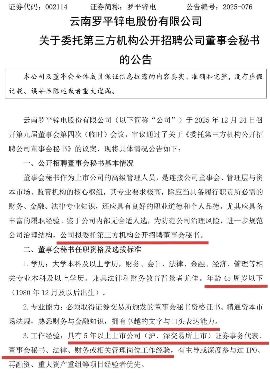 云南罗平锌电股份有限公司近日接连发布两份公告,宣布将委托第三方机构公开招聘董事会秘书和生产副总经理。