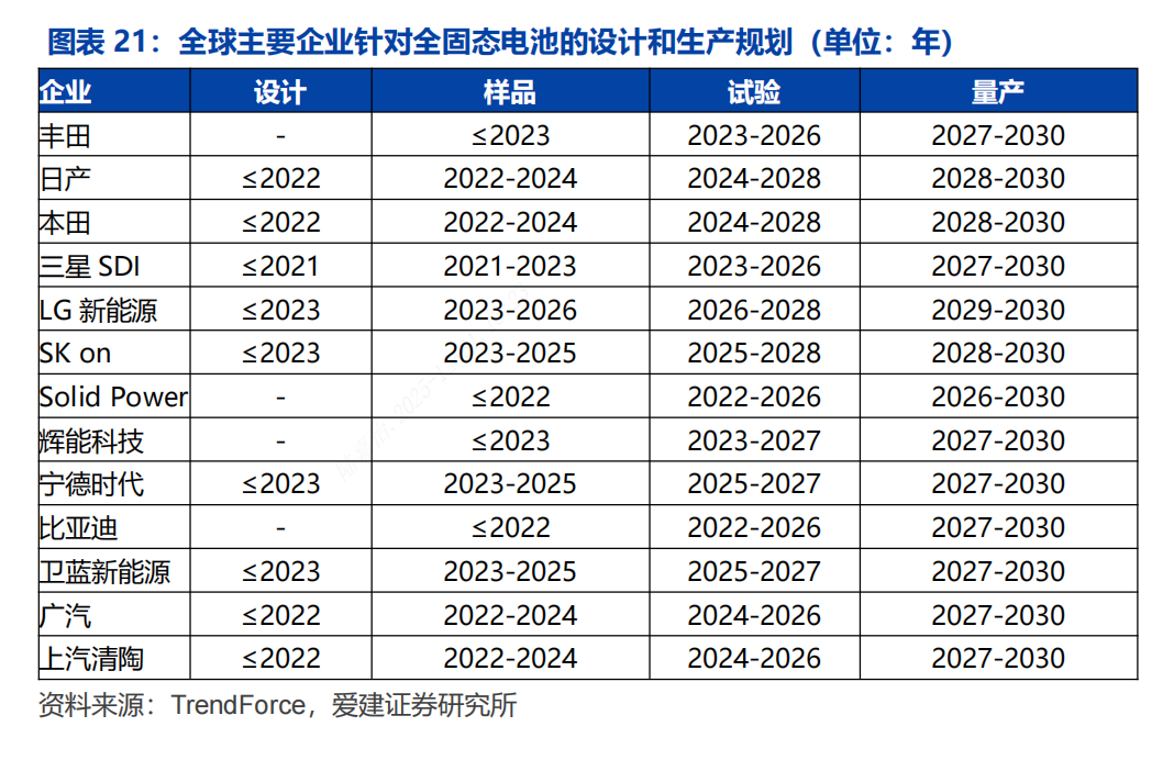 全球主要企业针对固态电池具有清晰的研发和量产规划,2027年将是关键节点。中美日布局较早,比亚迪,辉能科技,SolidPower和丰田率先制样(2021年)。Solid Power规划26年底实现全固态电池量产,丰田,三星,广汽,清陶等规划27年初实现量产。