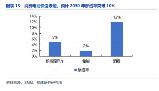 动力:国内半固态电池装车量呈现快速增长趋势,2025年上半年,仅卫蓝新能源360Wh/kg电池装车量就已经突破1.2GWh,动力电池或将成为固态电池最大的应用场景。消费:据SMM预测,消费电池由于对能量密度要求更高,叠加用户体验升级等因素,成为固态电池商业化落地的试验田,渗透率有望率先突破10%。储能:储能板块电芯成本敏感度较高,当前储能以配套示范性项目为主,预计2030年固态电池在储能的渗透率在2%左右。
