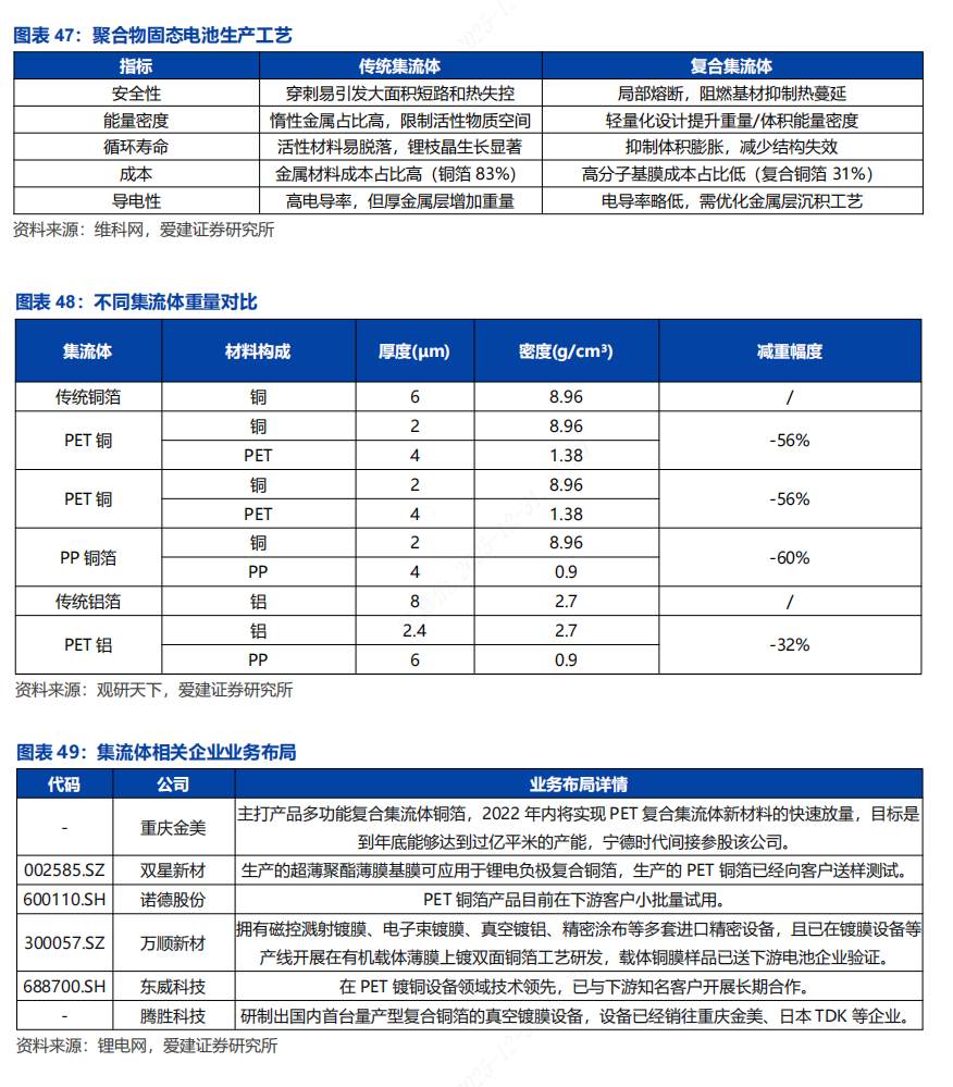 复合集流体具有三明治结构,具有安全性、成本和轻量化优势。传统集流体在固态电池中会限制能量密度提升且存在安全问题。复合集流体在高分子材料两面复合金属以保证导电性并提升综合性能,促进固态电池产业化。采用高分子材料复合,能够降低材料成本,削弱热失控风险,并有益于提升电池能量密度。主要布局公司已出货,二线仍处于研发试验阶段。