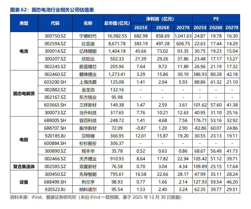 6.2 固态电池行业相关公司估值表