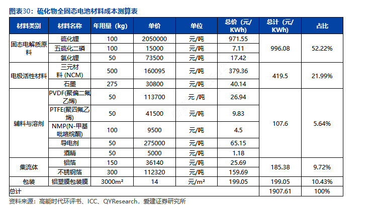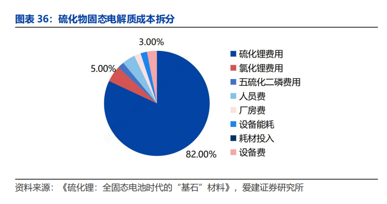 硫化物固态电解质的成本主要源于硫化锂。硫化物电解质成本主要源于硫化锂、氯化锂等原料和加工费用,硫化锂在硫化物固态电解质成本中占比超80%。