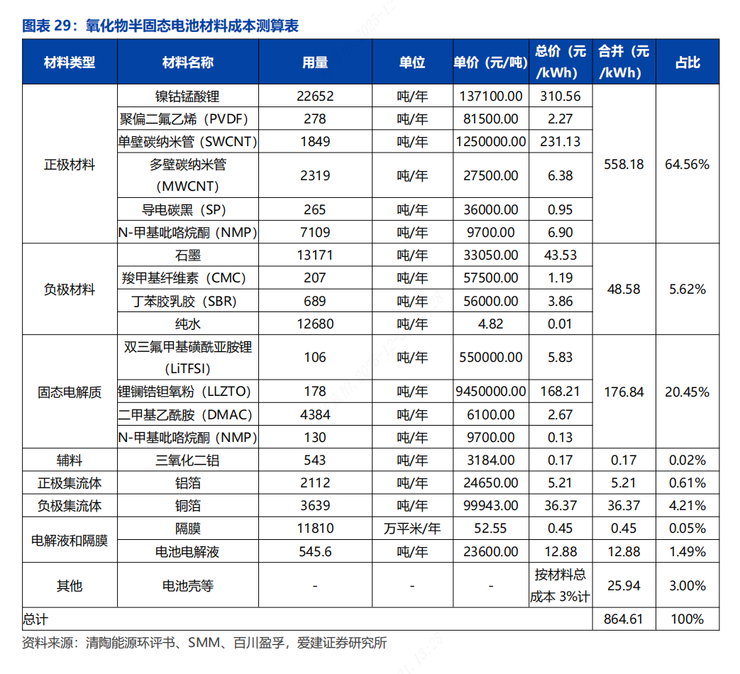 正极材料和固态电解质是氧化物半固态电池的主要成本来源。对于氧化物半固态电池,正极材料成本占比最高,约为65%,其次为固态电解质,成本占比约为20%,和锂离子电池的成本结构具有明显差异。