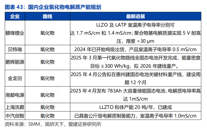 国内企业布局清晰。上海洗霸是国内能够实现LLZO电解质吨级量产的企业,2025年产能扩充至2000吨/年,配套比亚迪刀片固态电池项目。贝特瑞2024年开始吨级出货氧化物固态电解质产品。