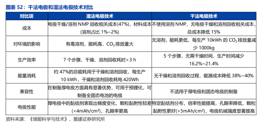 干法技术在成本、能量密度和材料兼容性等方面具优势。干法电极技术是一种不需要溶剂、环境友好、能耗较低的制造工艺,其最大的优势在于能够提高电极的压实密度,从而提升电池的能量密度,并且适配全固态电池中硫化物电解质、金属锂等对溶剂敏感组件的加工。