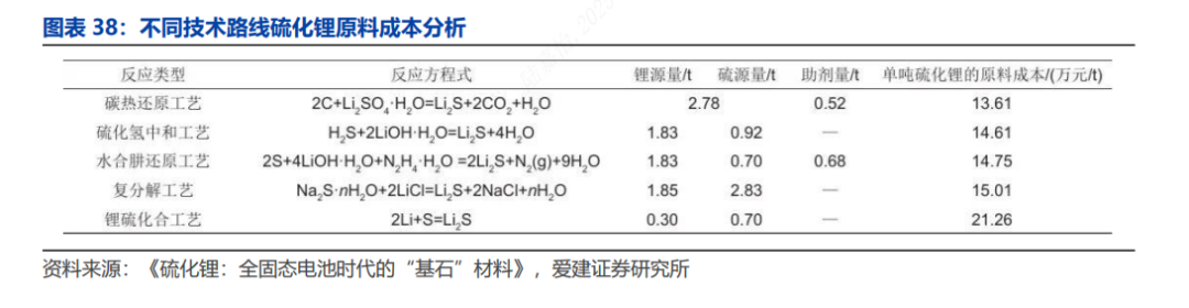 硫化锂是硫化物全固态电池的主要成本来源。在硫化物全固态电池成本构成中,固态电解质成本占比最高,可达50%以上,其中硫化锂在硫化物固态电解质生产成本中占比最高,因此,硫化锂降本是降低硫化物全固态电池成本的关键。