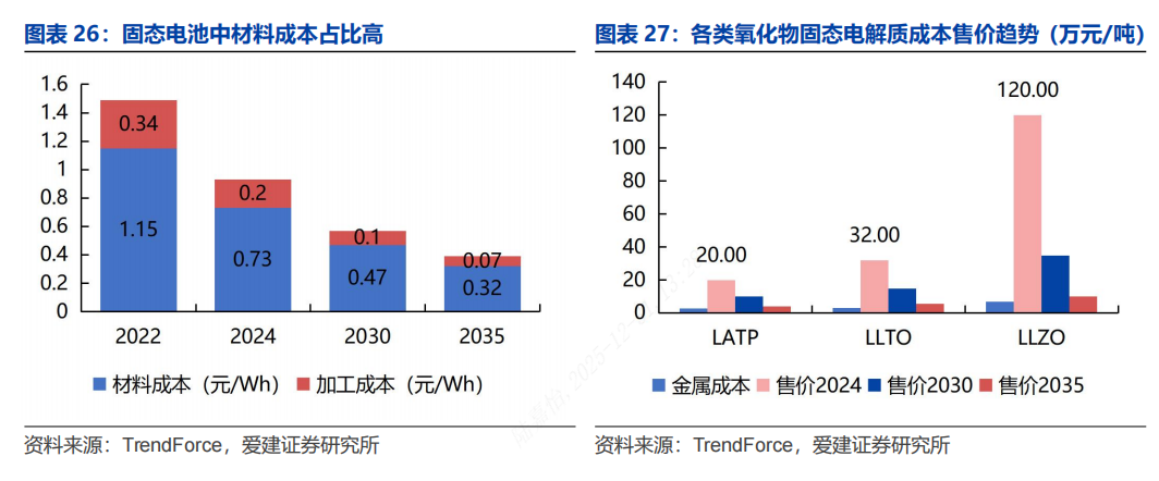 固态电池中材料成本占比高,成本降低是趋势。2022年,固态电池成本约为1.49元/Wh,其中材料成本约为1.15元/Wh,占比约为77%。预期电池成本逐步下降,2035年成本约为0.39元/Wh,材料成本占比约为82%。