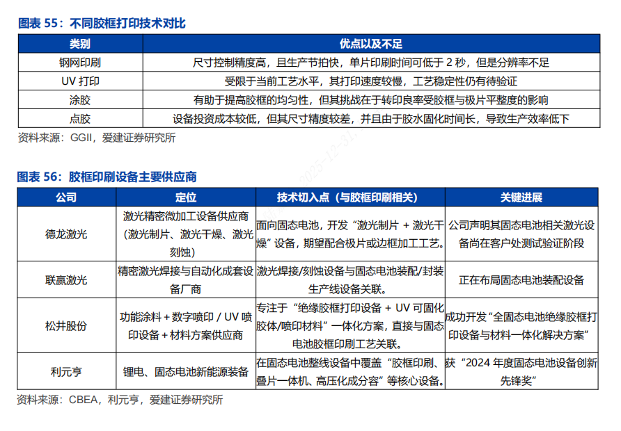 胶框打印具有支撑和绝缘作用,避免电池在高压力下短路。固态电池需要在高压力下进行制备以确保界面紧密接触,电池存在变形和内部短路的风险,胶框印刷在电极或电解质边缘打印一个回形胶框,起到支撑和绝缘的双重作用,以防止正负极直接接触短路。有多种胶框打印工艺,钢网印刷精度高节奏快。利元亨推荐钢网印刷方案,其高通量印刷系统能实现树脂胶框的高速、均匀涂布;松井股份则选择了新兴的UV打印技术。