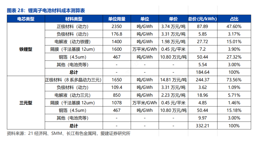 锂离子电池中正极材料成本占比最高。对于动力性磷酸铁锂电池,正极材料成本占比约为48%,其次为铜箔,成本占比约为27%;对于动力型三元电池,正比材料成本可达70%以上,其次为铜箔,成本占比约为15%。