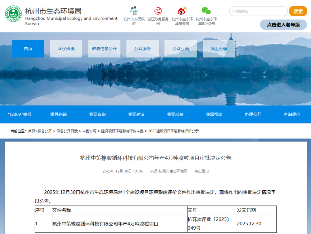 12月30日,杭州中策橡胶循环科技有限公司年产4万吨胶粒项目审批决定公告,杭州市生态环境局同意项目实施。
