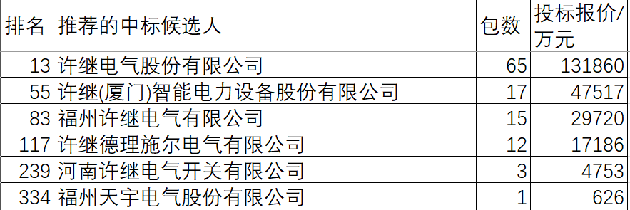 第55的许继(厦门)智能电力设备股份有限公司中17包47517万元。所中2类物资中,开关柜6包9129万元,组合电器11包38388万元。