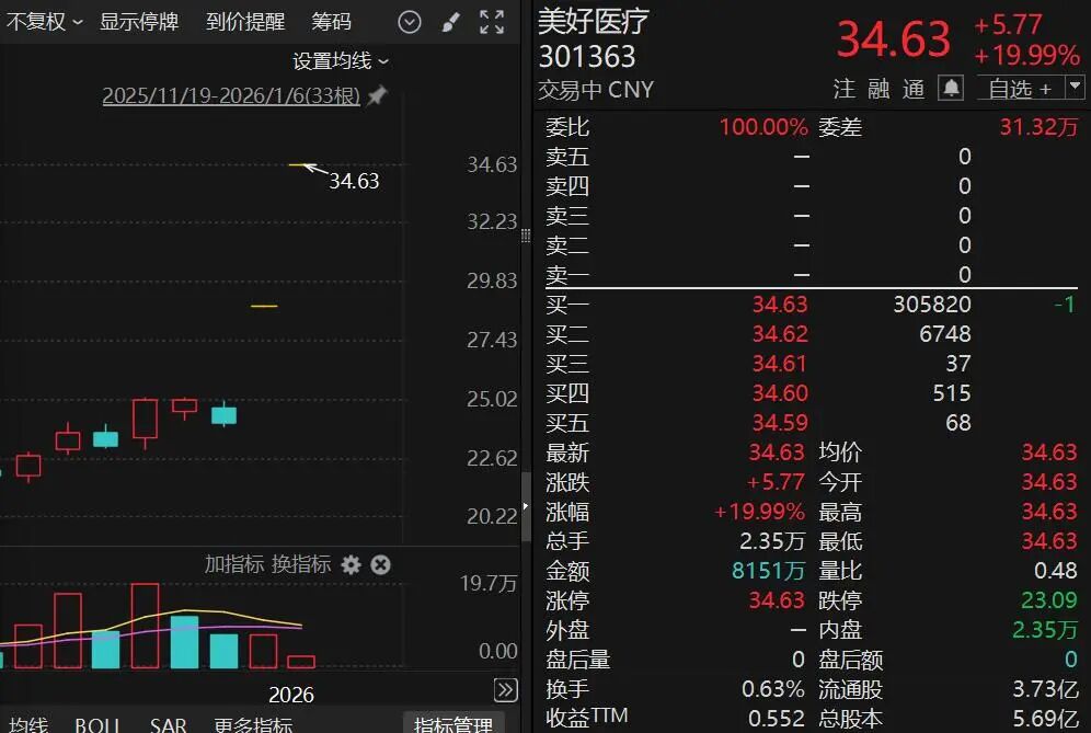 1月5日,美好医疗在深交所互动易平台表示,公司正与下游脑机接口客户深入开展产品合作,协助客户实现从实验室研发到批量出货的高效商业化转化。受此利好刺激,美好医疗(301363)连续2日20%一字涨停。