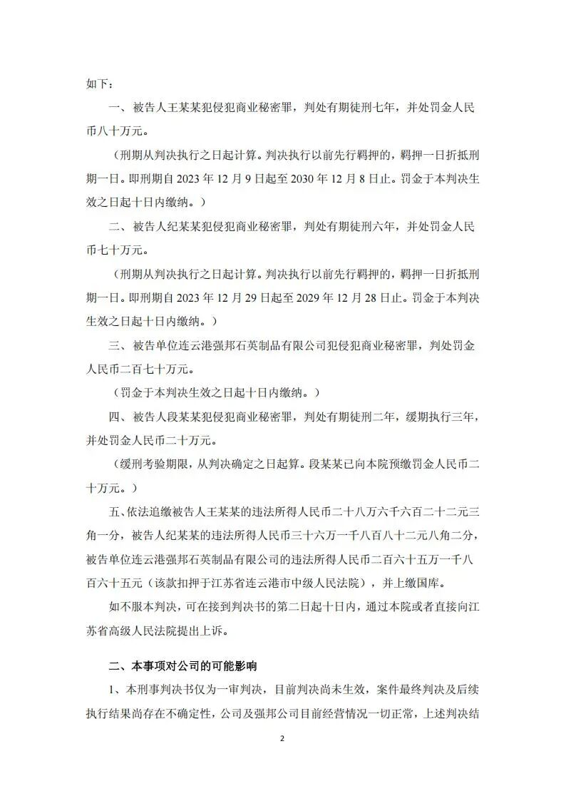 公告显示,2025年12月31日,石英股份及控股子公司连云港强邦石英制品有限公司(简称“强邦公司”)收到江苏省连云港市中级人民法院刑事判决书((2024)苏07刑初39号),判决如下: