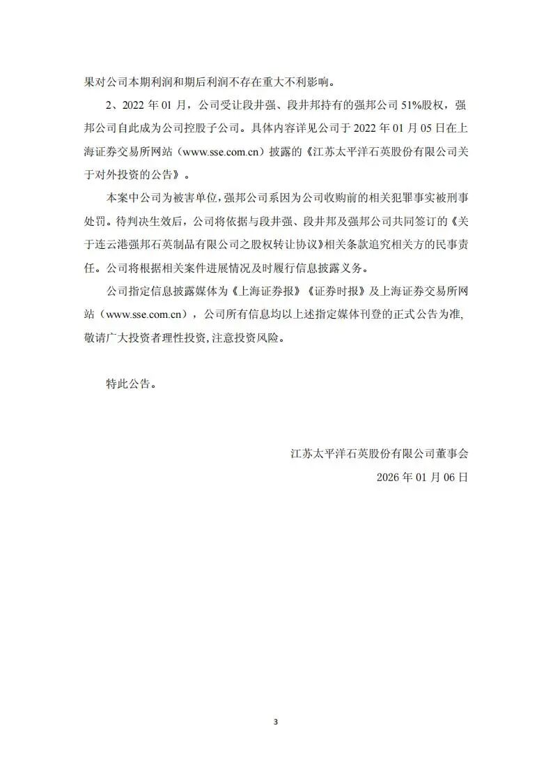 石英股份明确,本案中公司为被害单位,强邦公司系因为公司收购前的相关犯罪事实被刑事处罚。待判决生效后,公司将依据与段井强、段井邦及强邦公司共同签订的《关于连云港强邦石英制品有限公司之股权转让协议》相关条款追究相关方的民事责任。
