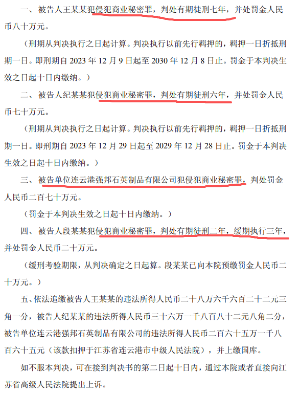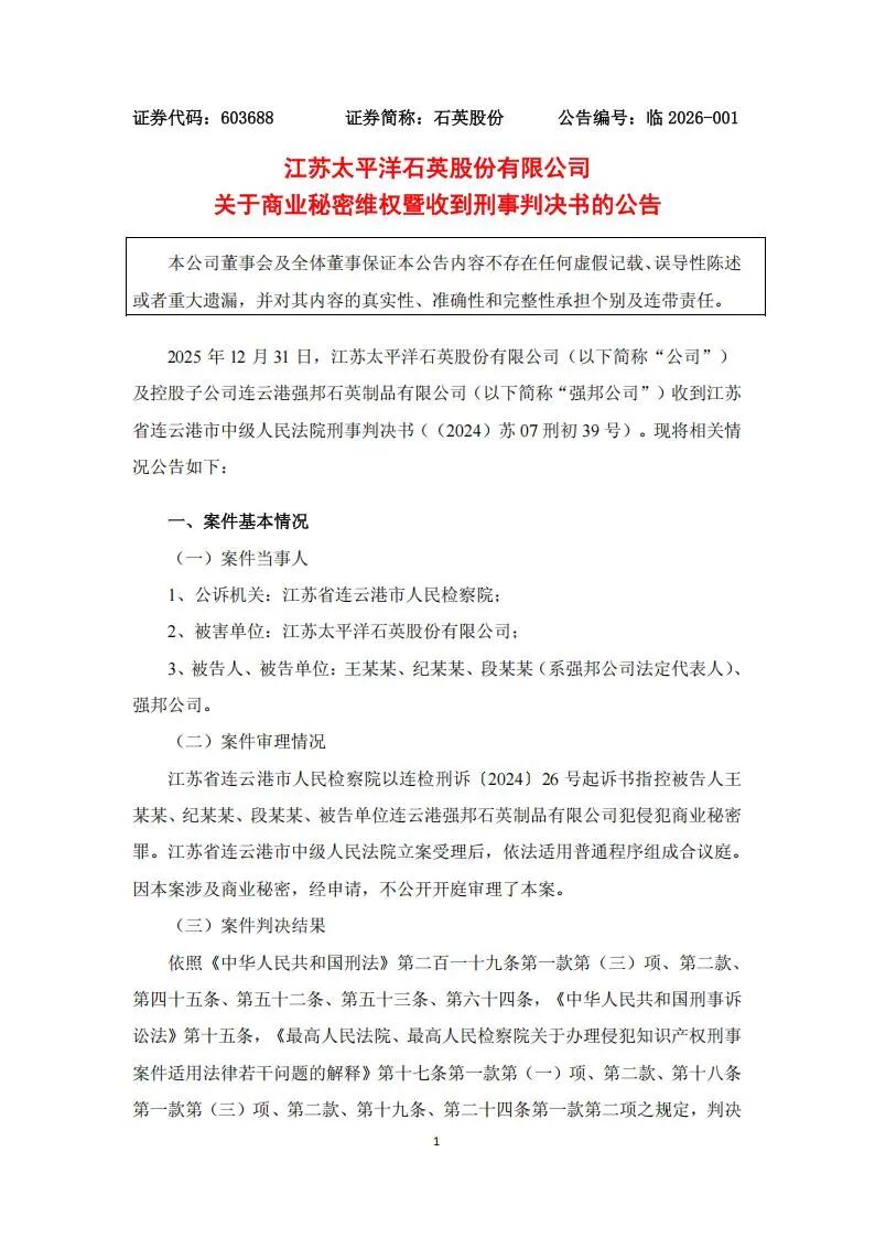 光伏见闻获悉,1月5日晚,石英股份发布江苏太平洋石英股份有限公司关于商业秘密维权暨收到刑事判决书的公告。