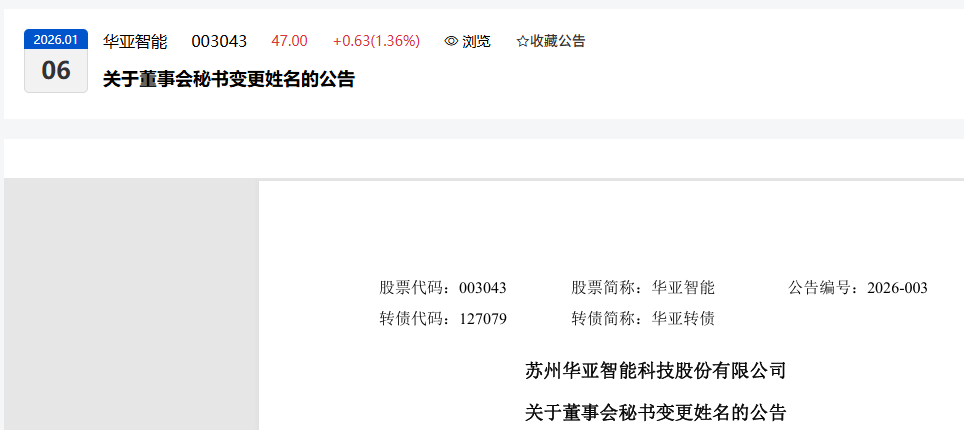 苏州华亚智能科技股份有限公司(以下简称“公司”)董事会近日收到公司董事会秘书杨曙光的通知,其提出的更名申请已获得登记机关的审批通过并办理了新的居民身份证,原姓名“杨曙光”变更为“杨桉博”。