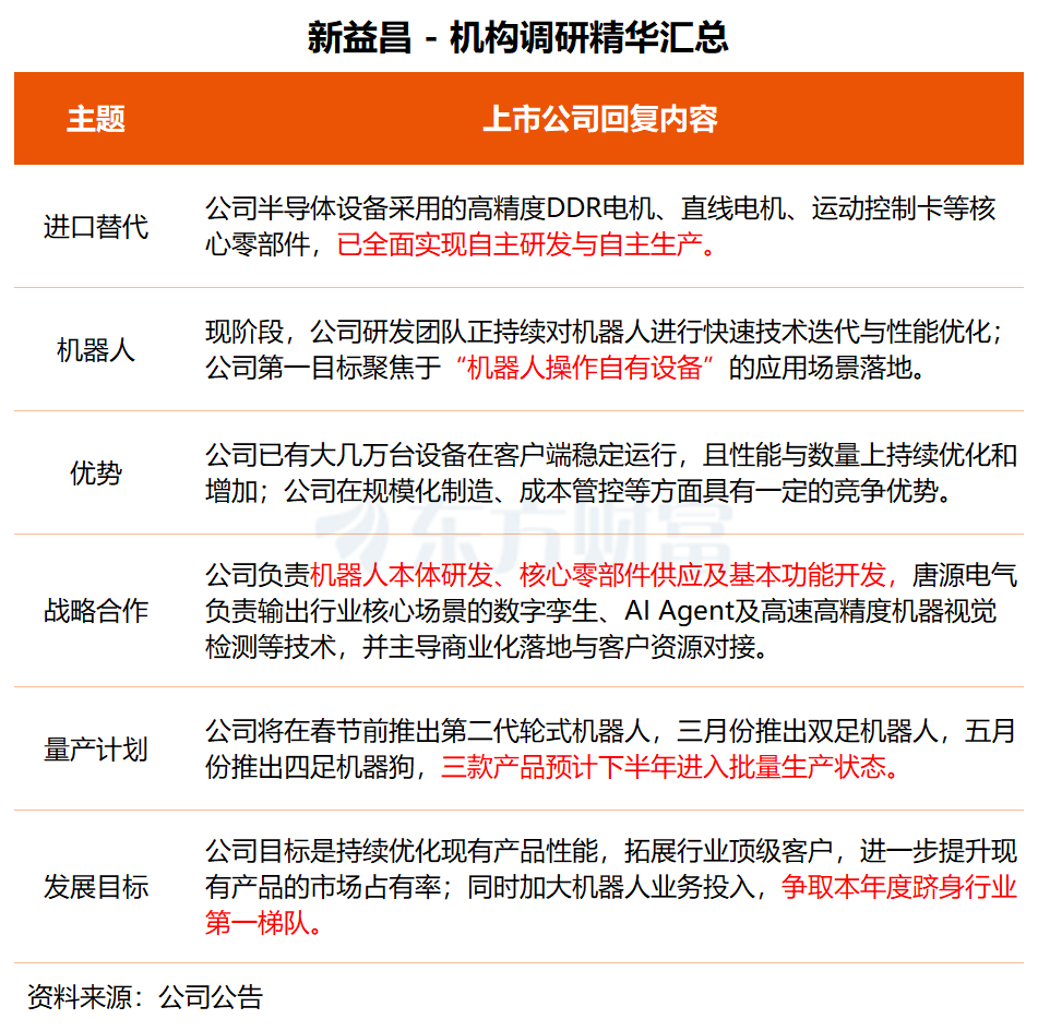 在调研中,新益昌透露,公司将在2026年春节前推出第二代轮式机器人,三月份推出双足机器人,五月份推出四足机器狗,三款产品预计在2026年下半年进入批量生产状态。