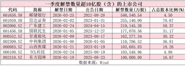 从解禁数量维度划分,2026年一季度A股解禁市场呈现出明显的头部集中特征,共有9家上市公司解禁数量超过10亿股(含)。