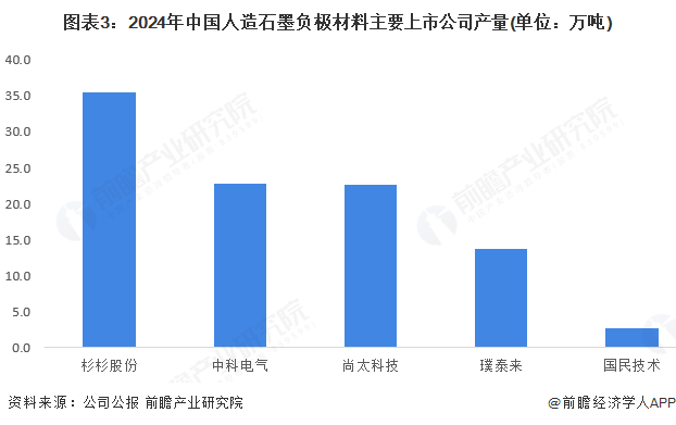 2024年,杉杉股份的人造石墨负极销量超30万吨,中科电气、尚太科技产量均超20万吨,以下5家上市公司的人造石墨负极材料销售量超过90万吨。