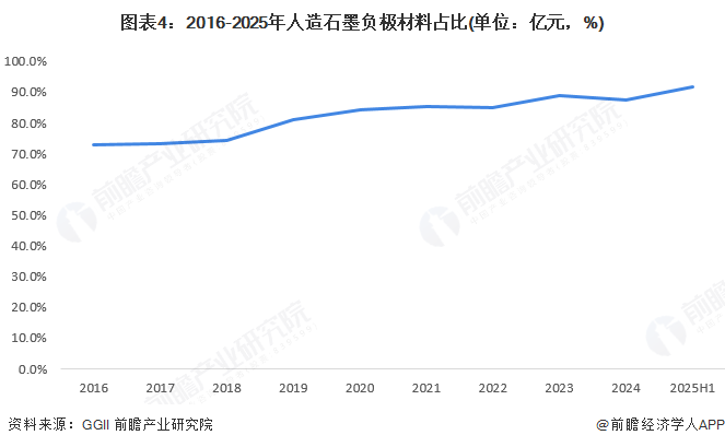 2016年以来,中国人造石墨负极材料出货量在所有石墨负极材料出货量中的占比呈现上升趋势,截至2025年上半年,人造石墨占比已经达到91.7%,较2024年的占比提升4.25%。