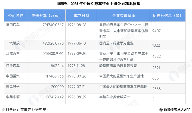 2、冷藏车行业上市公司基本信息对比