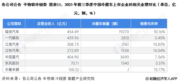目前,我国冷藏车行业的头部上市公司是福田汽车、中国重汽、江淮汽车等,这三家上市公司2025年前三季度的冷藏车销量在3000辆以上。2025年前三季度,中集车辆的销售毛利率最高,达15.17%。