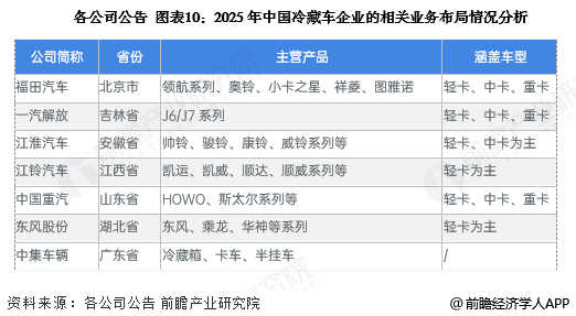 3、冷藏车行业企业产品布局对比