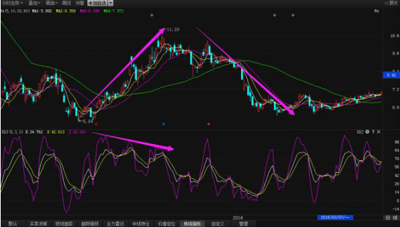 在KD指标中,当市场价格创出新高,但对应的KD值却未能创出新高值,这就构成了顶背离,说明上升趋势已经有发生反转的征兆;在下降趋势中,当市场价格创下新低,但相应的KD值却未能创出新低位,这就构成了底背离,它同样是下降趋势即将反转向上的预警信号 ,也是趁低买入的有利时机。