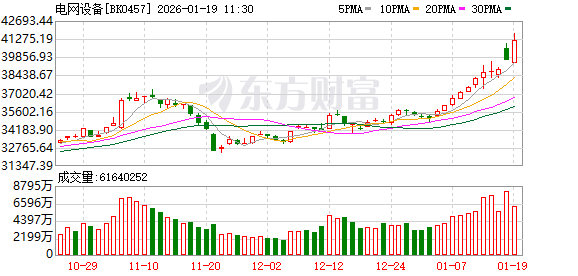 1月19日早盘电网设备板块表现强势,汉缆股份、森源电气、大连电瓷、中国西电、积成电子、广电电气、华明装备、宏盛华源涨停。双杰电气、亿能电力、红相股份、华自科技大涨超10%。
