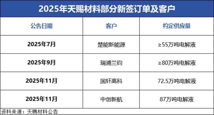 进入2025年后,天赐材料订单更如雪花般来袭。公司接下这泼天富贵,先后与Duksan Electera、楚能新能源、瑞浦兰钧、国轩高科、中创新航签订长供订单,电解液供应量近300万吨。