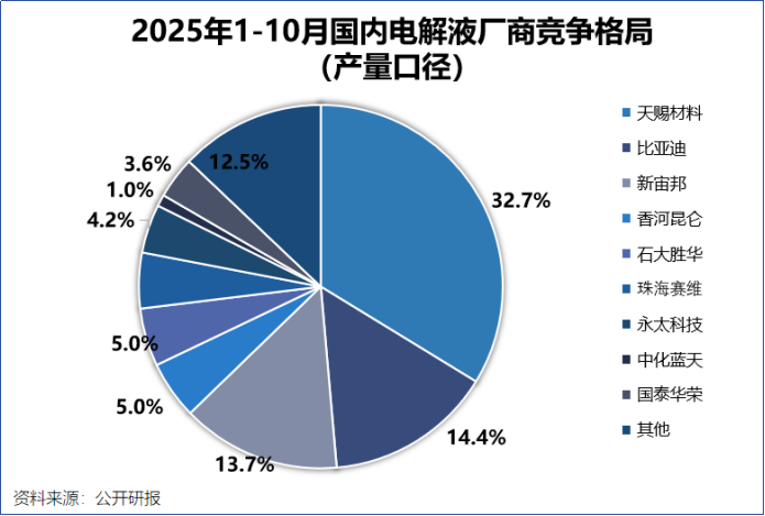 成本优势为天赐材料带来规模优势,2025年1-10月,公司电解液全球市占率超三成,稳居第一,比亚迪则依靠自身庞大的动力电池需求,占据市场份额第二的宝座。