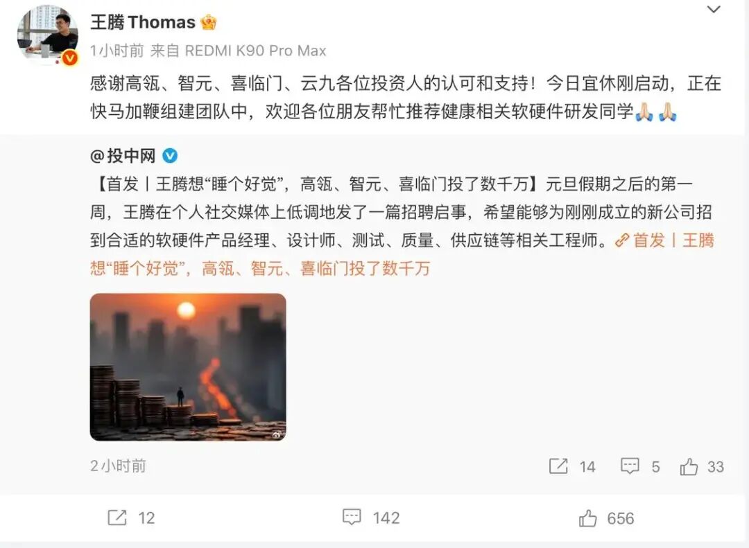 1月20日,王腾转发相关报道官宣融资喜讯,直言“正在快马加鞭组建团队中”,字里行间难掩对新事业的期待。