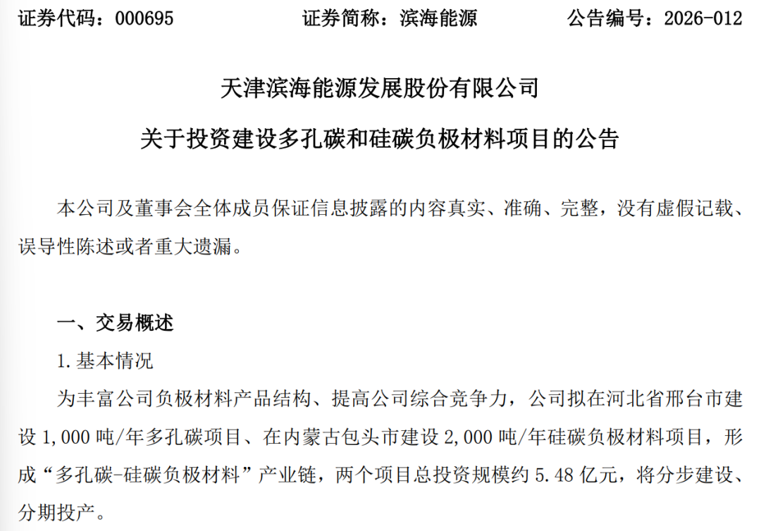 1月21日,滨海能源(000695.SZ)公告称,公司拟在河北省邢台市建设1,000吨/年多孔碳项目,在内蒙古包头市建设2,000吨/年硅碳负极材料项目,总投资规模约5.48亿元。两个项目将分步建设、分期投产,旨在丰富公司负极材料产品结构,提高综合竞争力。其中,多孔碳项目总投资12,070万元,硅碳负极材料项目总投资42,721万元。项目目前尚未开始实施,正在办理相关手续及前期施工准备。
