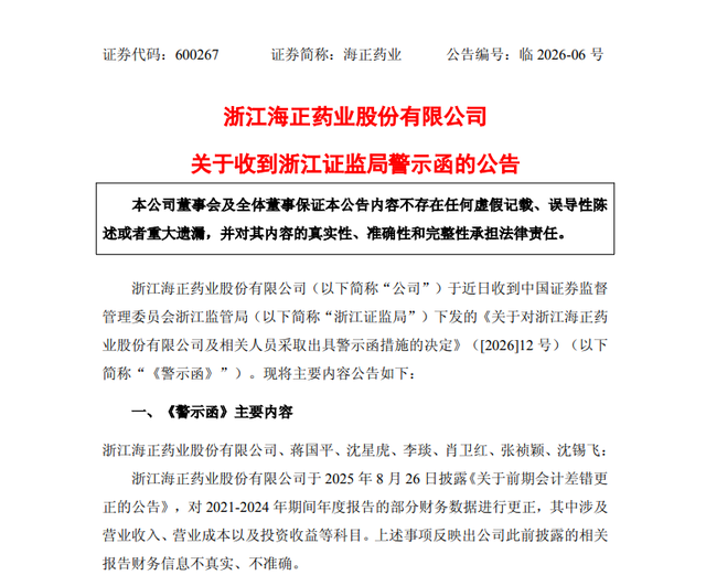 同日,浙江证监局也对海正药业出具警示函。海正药业发布公告称,公司近期收到浙江证监局下发的《关于对浙江海正药业股份有限公司及相关人员采取出具警示函措施的决定》。该警示函指出,海正药业在2025年8月26日发布了《关于前期会计差错更正的公告》,对2021年至2024年期间的财务数据进行了调整,涉及营业收入、营业成本和投资收益等关键科目,表明公司此前披露的信息存在不实情况。