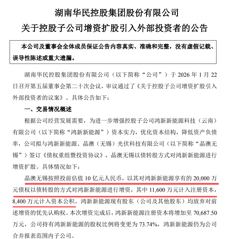 晶澳无锡按照投前估值 10 亿元人民币,以其对鸿新新能源享有的 20,000 万元债权以债转股的方式对鸿新新能源进行增资,其中 11,600 万元计入注册资本,8,400 万元计入资本公积。鸿新新能源现有股东(公司及其他股东)均放弃对前述增资的优先认购权。本次增资完成后,鸿新新能源注册资本将增加至 70,687.50万元,公司持有鸿新新能源的股权比例将变更为 73.74%,鸿新新能源仍为华民股份合并报表范围内子公司。