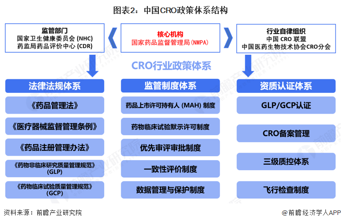 我国CRO行业政策体系以国家药品监督管理局(NMPA)为核心监管主体,联合卫健委(NHC)、药监局(CDR)等监管部门协同发力,以《药品管理法》等为法律基础,通过MAH制度、临床试验默示许可、GLP/GCP认证、优先审评审批等核心监管制度规范行业发展、释放创新活力,再结合行业协会自律监督,强化研发质量与安全监管,推动行业与国际接轨,为医药创新提供全方位制度保障。