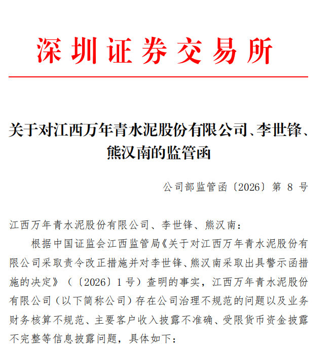 上证报中国证券网讯(记者 王凯丰)万年青1月23日收到深交所监管函。深交所表示,根据江西证监局查明的事实,万年青存在公司治理不规范的问题以及业务财务核算不规范、主要客户收入披露不准确、受限货币资金披露不完整等信息披露问题,具体如下: