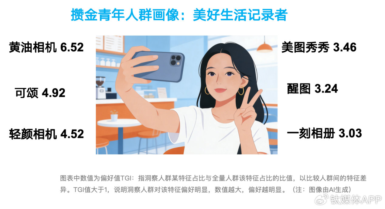 同时他们也喜欢记录美好,分享美好。每日互动大数据显示,攒金青年对黄油相机、可颂、轻颜相机、醒图等图片美化类APP的偏好明显,TGI值分别为6.52、4.92、4.52、3.24、。