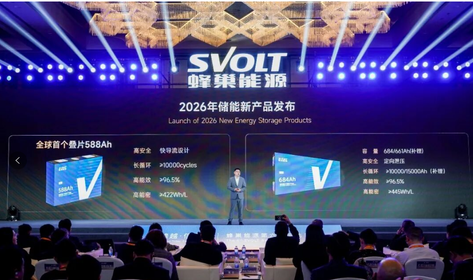 2026年1月13日,蜂巢能源发布了储能电池、电芯产品,产品线清晰划分了“这一代”与“下一代”储能电芯。这一代核心产品包括基于叠片技术的588Ah电芯(循环超1万次,能效高于96.5%,配套6.26MWh系统)以及684Ah/661Ah电芯,其中684Ah版强化了定向泄压安全设计,而661Ah作为补锂版本将循环寿命提升至1.5万次,面向长寿命场景。