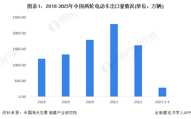 我国不仅是全球最大的两轮车生产基地,也是全球最大的两轮电动车出口国。近几年两轮电动车出口表现火热,据中国海关总署统计数据,2018 - 2022年,我国两轮电动车出口数量在2021年达到近五年最高值,全年共出口2287.08万辆两轮电动自行车。2023年1-3月,中国两轮电动车出口数量为279.15万辆。