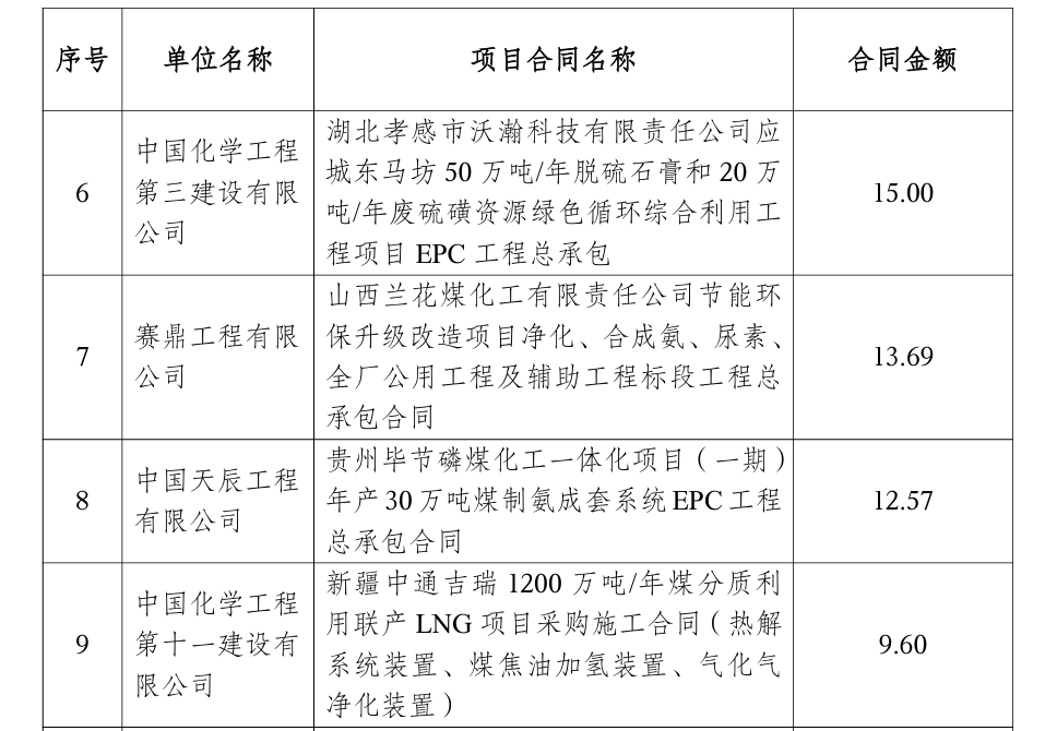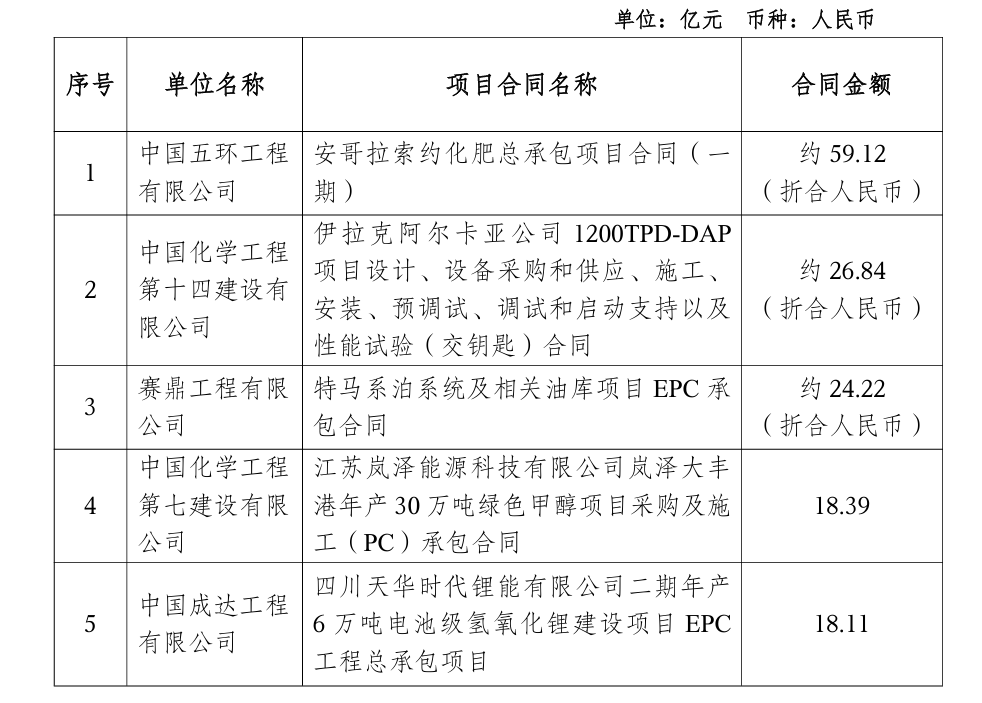 其中超过百亿的项目2个:由中国成达工程有限公司签订的尼日利亚MIPL化肥项目EPC合同,金额约合人民币151.65亿元;由中国化学工程第七建设有限公司签订的纳米比亚海芬绿氢(绿氨)项目,合同金额约合人民币143.45亿元。