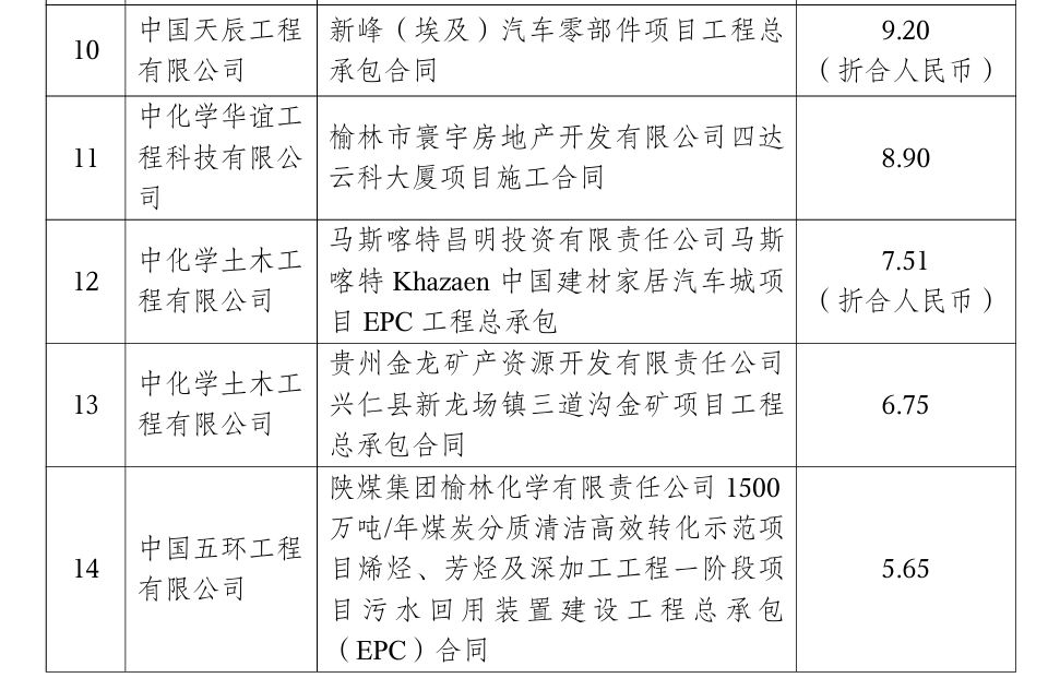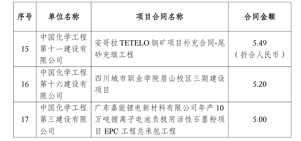 12月,中国化学单笔合同额在人民币5亿元以上的重大合同17个,主要如下:
