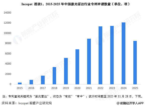 根据Incopat披露的数据,2015-2024年中国激光雷达专利申请数量逐年递增。2024年中国激光雷达行业专利申请数量达到12091项,达到近年来最高值;2025年截至11月,专利申请数量为8466项。