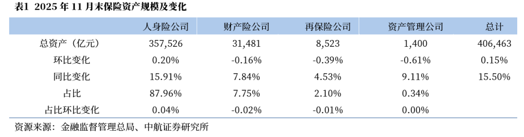 截至2025年11月,保险公司总资产为40.65万亿元,环比+0.15%,同比+15.50%。其中人身险公司总资产35.75万亿元,环比+0.20%,同比+15.91%,占总资产的比重为87.96%;财产险公司总资产3.15万亿元,环比-1.16%,同比+7.84%,占总资产的比重为7.75%。